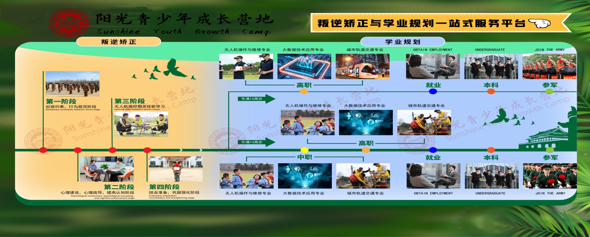 阳光青少年成长特训营地用于多年的经验,也深知家长和孩子在各个阶段的诉求,协同相关资源和能力,全力为孩子的成长助力,具体的叛逆矫正和学业方面规划可参考如下图所示: